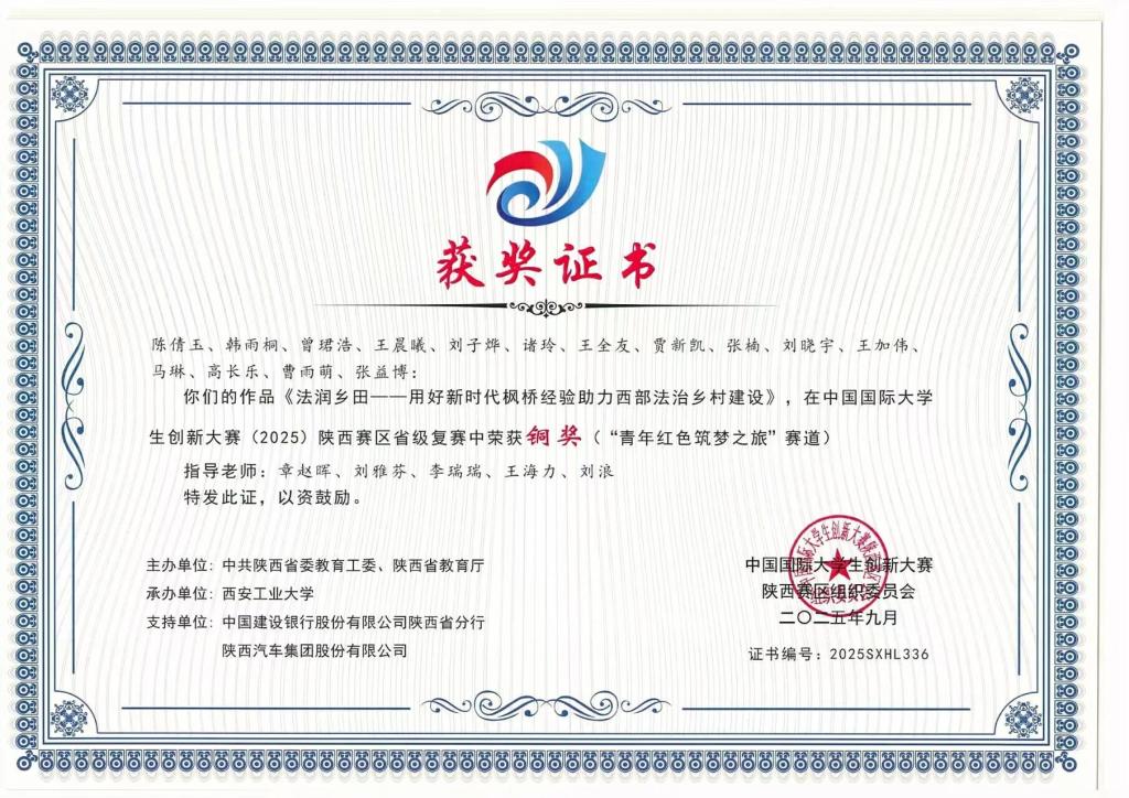 近日,2025年中国国际大学生创新大赛(2025)陕西赛区省级复赛获奖名单正式公布。榆林学院法学与历史文化学院“春风法雨润乡田”团队凭借作品《法润乡田——用好新时代枫桥经验助力西部法治乡村建设》,在竞争激烈的“青年红色筑梦之旅”赛道中脱颖而出,荣获省级铜奖。
